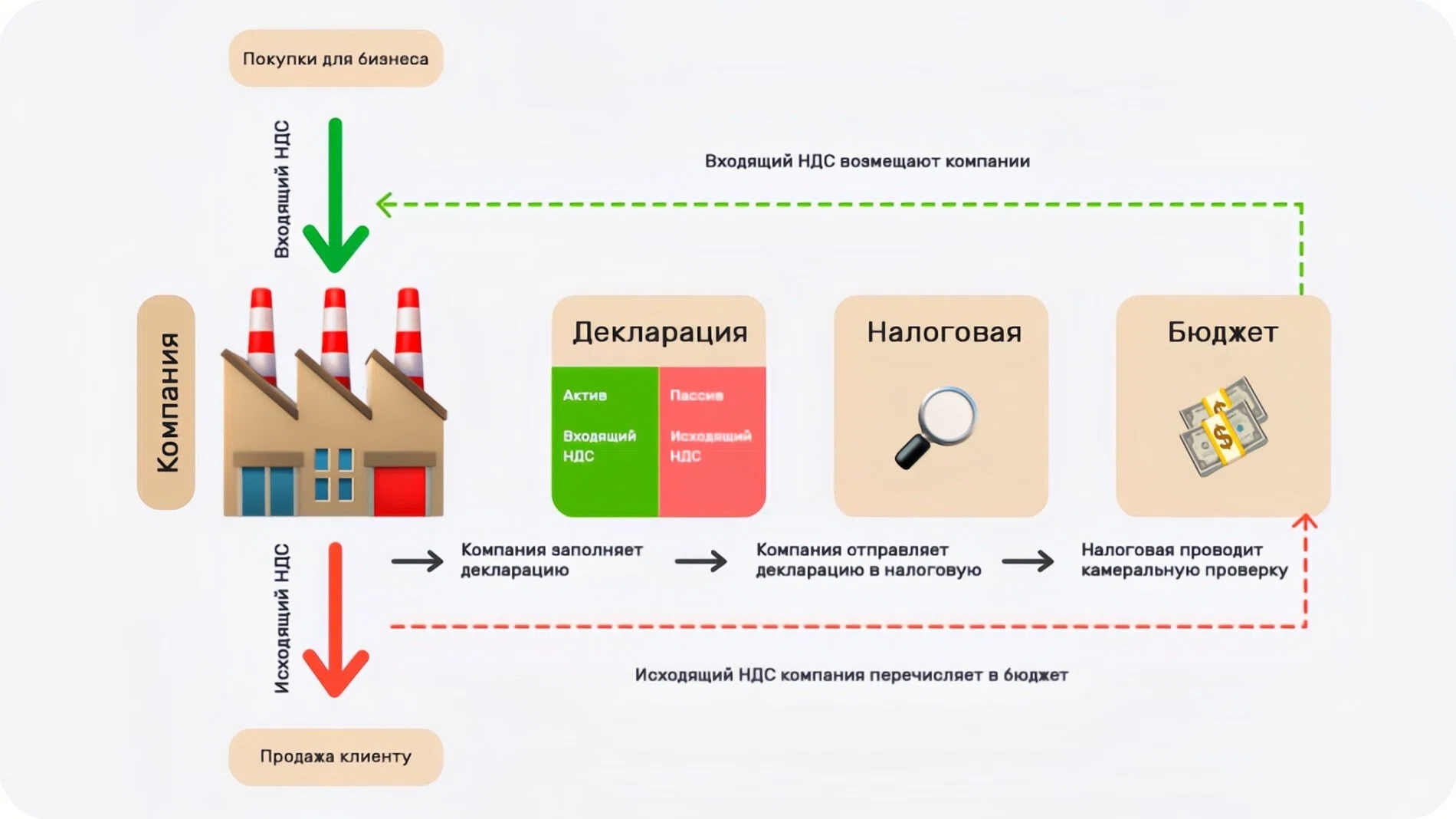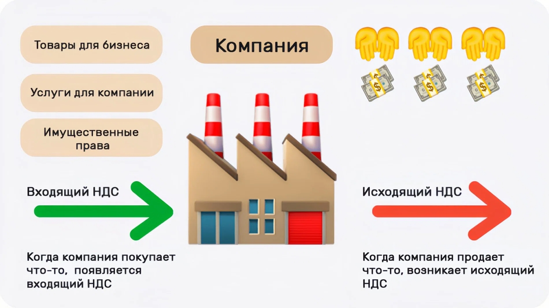 Если поставщики работают с НДС, то все эти покупки уже включают налог. Государство возмещает входящий НДС компании — это называется вычетом. То есть компания сначала платит, а потом получает деньги назад через механизм налогового вычета.